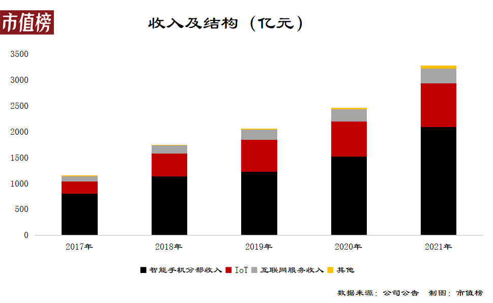 2021年全年,小米的營(yíng)業(yè)收入為3283億元,同比增長(zhǎng)33.5%,經(jīng)調(diào)整凈利潤(rùn)為220億元,同比增長(zhǎng) 69.5%。