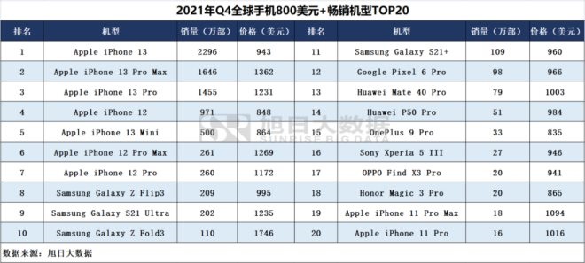 如林美炳所言,旭日大數(shù)據(jù)發(fā)布的《2021年Q4全球暢銷手機(jī)市場(chǎng)分析報(bào)告》( 以下簡(jiǎn)稱《報(bào)告》 )顯示,2021年Q4超800美元以上全球暢銷手機(jī)TOP20總銷量為8381萬部,與Q3季度4901萬部相比,增長(zhǎng)了71%。其中,暢銷機(jī)型TOP20中,蘋果占據(jù)9款,達(dá)到歷史新高。三星4款,華為2款,google 、一加、索尼、OPPO、榮耀各1款。