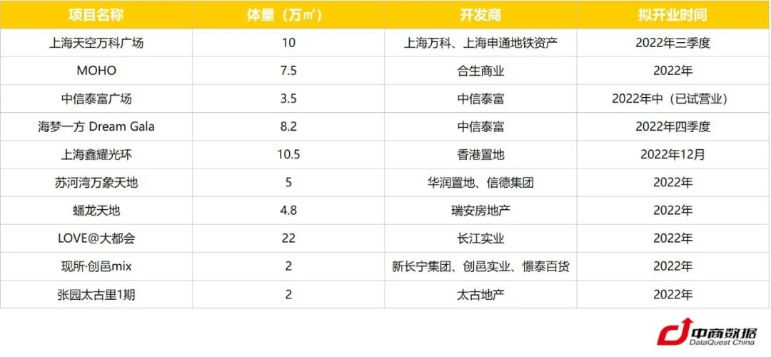一季度上海無大型商業(yè)項目開幕。部門存量改造項目如巴黎春天百貨淮海店、徐匯衡復(fù)東平路音樂主題街區(qū)、現(xiàn)所·創(chuàng)邑mix部分商家等開啟試營業(yè)。2022年全年,蟠龍?zhí)斓、張園1期、鑫耀中環(huán)、上海天空萬科廣場、蘇河灣萬象天地、MOHO上海等重點項目將開業(yè),備受市場及消費者期待。