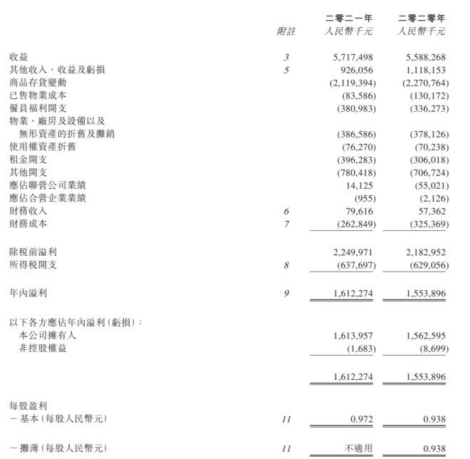 根據(jù)公告,2021年金鷹實(shí)現(xiàn)銷售所得款項(xiàng)總額為人民幣171.88億元,同比增加4.6%;同店銷售增加6.1%;實(shí)現(xiàn)收益57.17億元,同比增加2.3%;公司擁有人應(yīng)占溢利為人民幣16.14億元,同比增加3.3%。