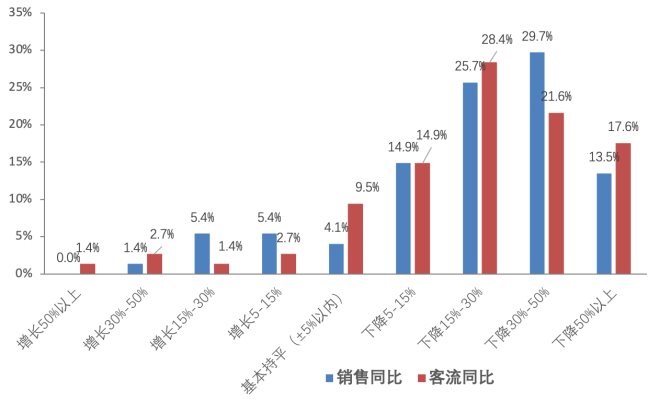 調研顯示,所有百貨、購物中心自2022年以來,銷售與客流相比去年同期均有所下降,超過八成(81.8%)的百貨、購物中心企業(yè)表示,其銷售和客流同比去年的下降幅度均超過15%。
