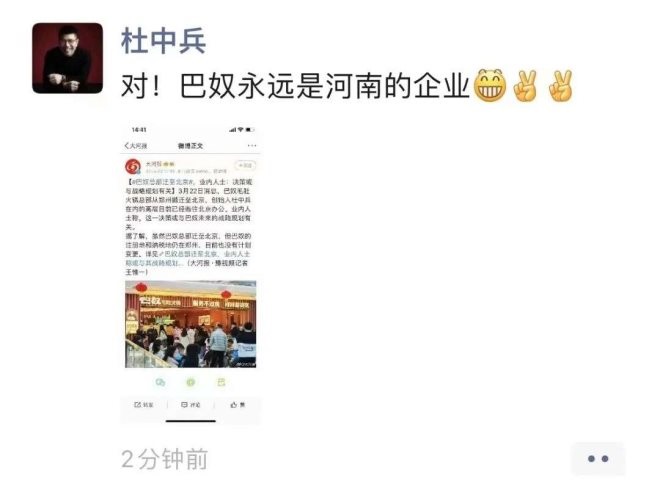 3月22日,大河報·豫視頻報道,巴奴總部從鄭州搬遷至北京,創(chuàng)始人杜中兵在內的高層目前已經搬往北京辦公。