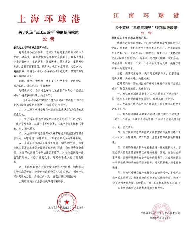 “三減半”是指:對兩家環(huán)球港品牌商戶的相關(guān)費用實行三減政策:一減半個月租金,二減半個月物管費,三減半個月能耗費(指水、電、燃氣費)。此外,公告還宣布將為兩地犧牲在抗疫一線人員的家屬提供援助。