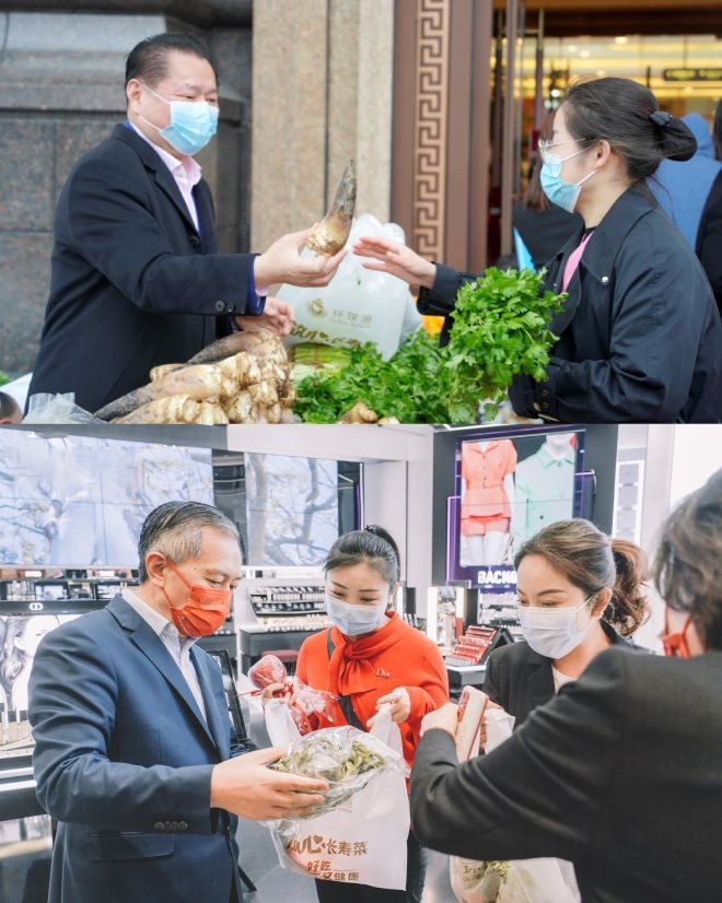 月星集團董事局主席丁佐宏(上),月星集團董事、執(zhí)行總裁丁佐勇(下)分別在環(huán)球港外廣場和環(huán)球港內(nèi)向消費者、品牌商戶和周邊居民等發(fā)放蔬菜。