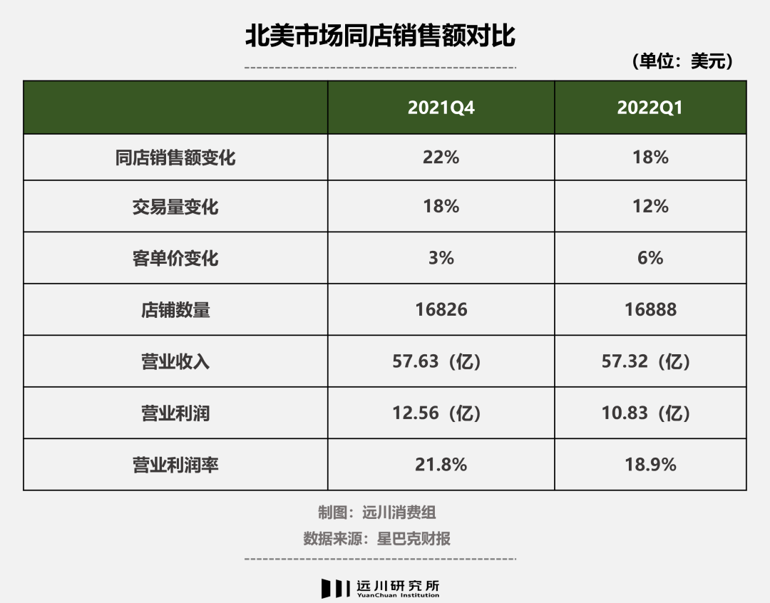 在北美市場,星巴克2022財(cái)年Q1的同店銷售額同比上漲18%,其中交易量上漲12%,客單價(jià)上漲6%,這是兩輪調(diào)價(jià)后的第一個(gè)財(cái)季。但在調(diào)價(jià)措施剛起步的上一財(cái)季(2021財(cái)年Q4),當(dāng)季星巴克同店銷售額的增幅還主要是靠交易量的上漲(18%),而非客單價(jià)(3%)。