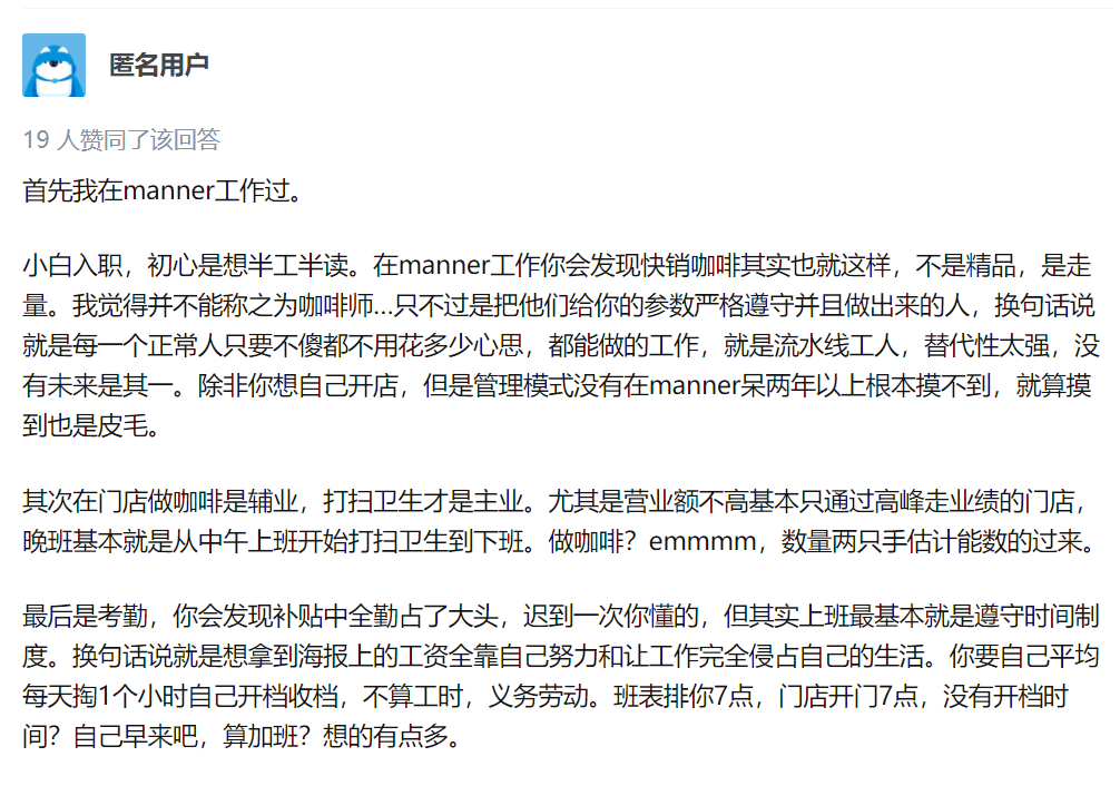 Manner 咖啡師談工作感受,圖源:知乎