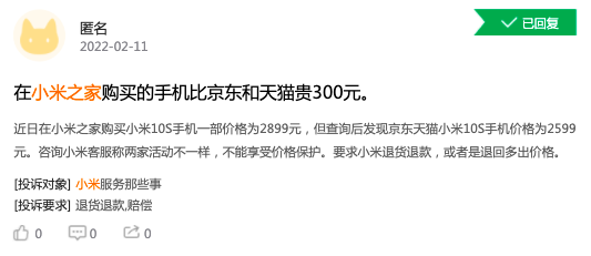 今年2月11日,一位消費(fèi)者在黑貓投訴平臺(tái)上表示,在小米之家購買的手機(jī)比京東和天貓貴300元。小米客服稱兩家活動(dòng)不一樣,不能享受價(jià)格保護(hù)。此外,在黑貓投訴平臺(tái)上有關(guān)“小米之家”的投訴量達(dá)1491條,多數(shù)集中在產(chǎn)品質(zhì)量、價(jià)格,售后不維修、拒絕退換貨等。