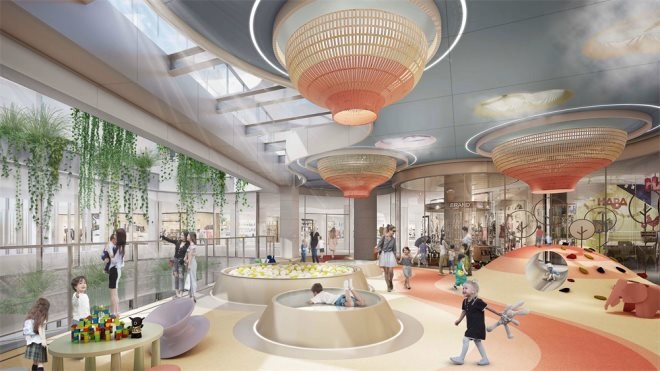 比如AB館空中連廊,以富有韻律動(dòng)感的彩色浪潮進(jìn)行天花裝飾,為休憩增添了空間氛圍。BD館地下連廊,除了聯(lián)通B和D館的功能性以外,還具有休憩、策展等時(shí)尚體驗(yàn)功能,將成為潮流達(dá)人打卡點(diǎn)的網(wǎng)紅區(qū)域。CD館室內(nèi)中央連廊設(shè)有半戶外特色區(qū),讓顧客身處室內(nèi)可近距離感受戶外庭院、親近大自然,同時(shí)在不同樓層體驗(yàn)不同的主題氛圍,實(shí)現(xiàn)“移步換景”。CD館三樓連廊設(shè)置了熱氣球、滑滑梯、攀爬墻,勢必將成為兒童的天堂。