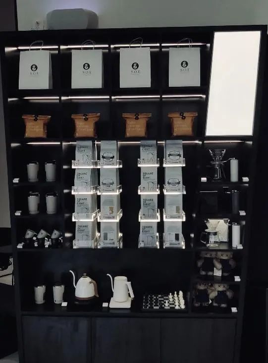 廣州首店仍然以黑白兩色作為室內(nèi)裝潢的主色調(diào),并且除了現(xiàn)場制作的咖啡飲品之外,店內(nèi)的貨架上還擺放著一些零售的咖啡產(chǎn)品及周邊可供消費者選購。