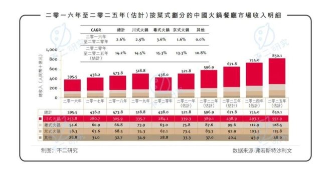 根據(jù)弗若斯特沙利文,按2020年收入計,火鍋占中國內(nèi)地整體中式菜肴市場的14.1%;預(yù)計2021年中國火鍋餐廳的整體市場規(guī)模為5218億元,其中川式火鍋占據(jù)65.02%的份額,粵式火鍋和京式火鍋則分別占據(jù)14.53%和14.07%。