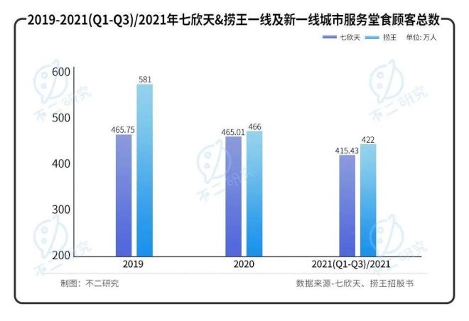 招股書顯示,2019~2020年,七欣天在一線及新一線城市的門店中所服務(wù)的堂食顧客總數(shù)逐年下滑,分別為465.75萬和465.01萬人;同期撈王則面臨一線城市門店顧客總數(shù)、翻臺率的雙重壓力,日均銷售額從3.47萬元下滑至2.85萬元。