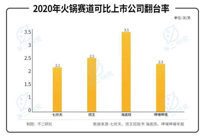 但要論核心指標翻臺率,七欣天和撈王與火鍋巨頭海底撈之間仍存在差距。2020年,七欣天的翻臺率為2.1次/天、撈王的翻臺率為2.5次/天;海底撈則為3.5次/天;呷哺呷哺以2.3次/天。
