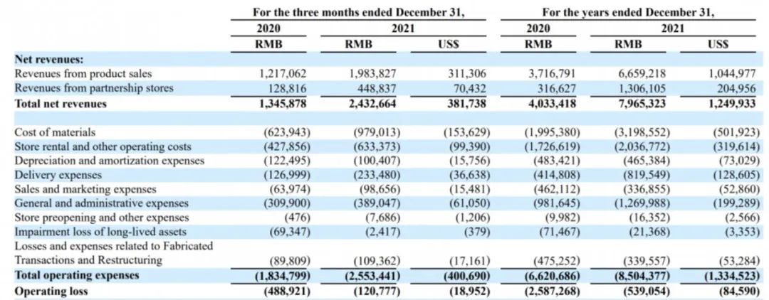 全國(guó)超過(guò)6000家門店,年總凈收入與Q4總凈收入迎來(lái)同比高達(dá)97.5%、80.7%的增長(zhǎng),兩項(xiàng)口徑下的虧損均較上年減少,瑞幸距離盈利僅“一步之遙”。
