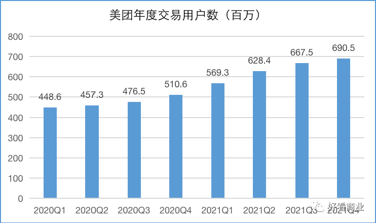 2021年Q1末,美團(tuán)年度交易用戶接近5.7億,單季凈增5870萬;加上2020年Q4凈增的3410萬,兩個(gè)季度新增了近1億用戶。