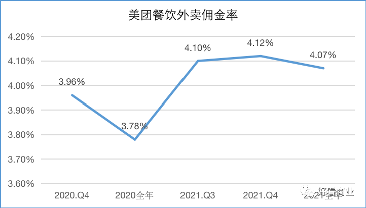 值得一提的是美團(tuán)向餐飲商家收取的傭金率。據(jù)財(cái)報(bào)披露的數(shù)據(jù)計(jì)算,Q4美團(tuán)餐飲外賣的傭金率為4.12%,高于Q3的4.1%和Q3的3.96%。2021全年的傭金率為4.07%,高于2020年的3.78%。