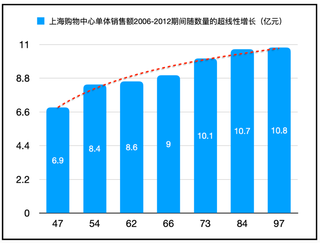 由此,特別告誡購(gòu)物中心連鎖企業(yè)不能用線性思維制定發(fā)展目標(biāo),以為銷售額會(huì)隨規(guī)模成正比的增長(zhǎng)!但是為什么人們會(huì)這樣決策?主要有兩個(gè)原因,一個(gè)是一些連鎖購(gòu)物中心企業(yè)在發(fā)展初期幾乎都經(jīng)歷過(guò)一段線性甚至是超線性的增長(zhǎng)期。我們依然能夠用上海購(gòu)物中心的早期發(fā)展說(shuō)明,如果僅看圖5中的2006—2012年即上海購(gòu)物中心的數(shù)量達(dá)到100個(gè)之前的情況,這段期間銷售額的增長(zhǎng)確實(shí)是快過(guò)數(shù)量的增長(zhǎng)的,如圖7所示。