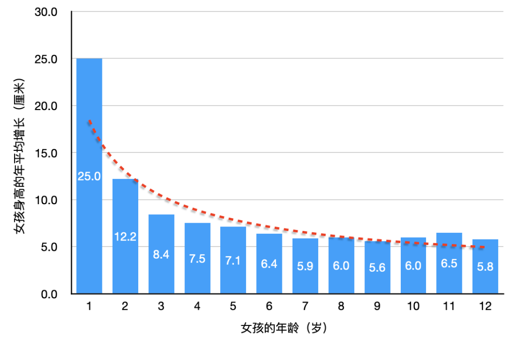 這里,筆者嘗試用一個(gè)最簡(jiǎn)單的我們?nèi)祟悶槭裁吹?8歲成年后就不再長(zhǎng)高的例子說(shuō)明。筆者隨機(jī)選取某婦幼保健院公布的從1周歲到12周歲的女孩的平均身高對(duì)照表,看一下她們?cè)谏跗诘纳L(zhǎng)速度(見(jiàn)圖8)。