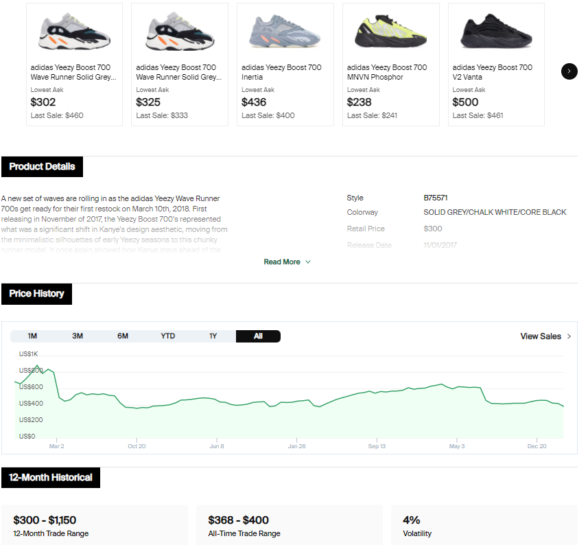 StockX非常大方直白,每雙鞋有專屬的價格k線圖,可查看收益率,許多“鞋神”買進賣出全程沒摸過實物。但國內(nèi),這些數(shù)據(jù)工具一律不能出現(xiàn)。
