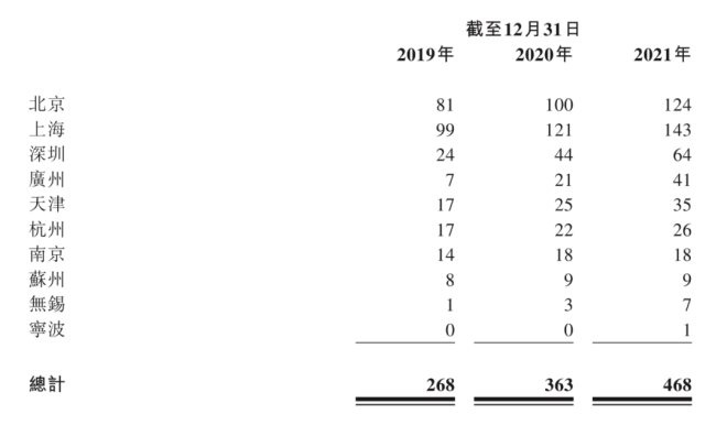 從單店來看,2019年至2021年,北京與上海門店的平均日銷售額分別為12009元、12122元和12781元;新成長型市場(深圳、廣州、杭州、天津、南京、蘇州、無錫、寧波)的平均日銷售額則分別為5892元、6002元和7617元。