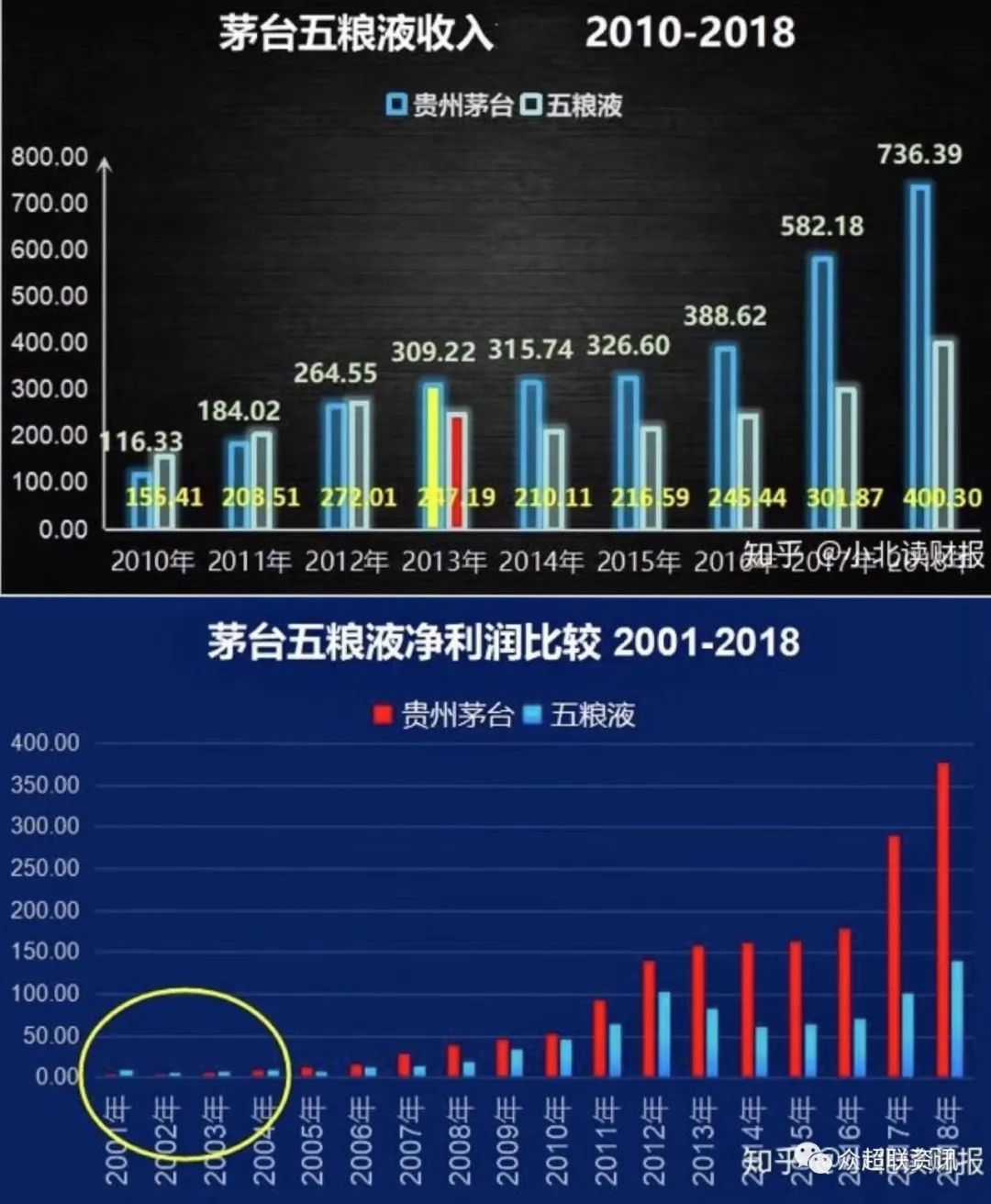 2001年,茅臺上市,市值僅有92.53億。五糧液當時的市值是193.64億元,是茅臺的一倍以上。