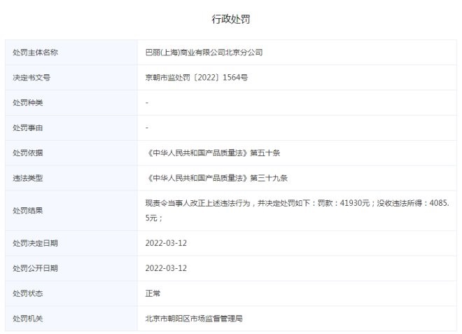 事實(shí)上,這不是該公司第一次被罰,2021年,巴麗(上海)商業(yè)有限公司北京國貿(mào)分公司也因產(chǎn)品抽檢不合格,而被北京市朝陽區(qū)市場監(jiān)督管理局判處行政處罰,罰款25000元。