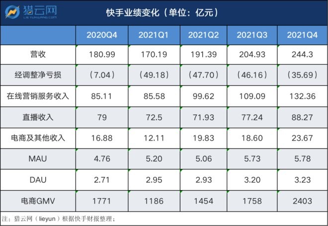 具體到第四季度,快手總營收達(dá)到約244億元,同比增長35%,經(jīng)調(diào)整后的凈虧損約36億元,同比擴(kuò)大,但較三季度的46.16億元,環(huán)比有所收窄。