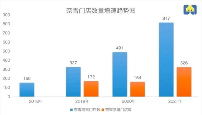 過去一年,幾乎每天都有一家奈雪新店落地。到2021年末,奈雪共有817家門店,其中326家是新店。