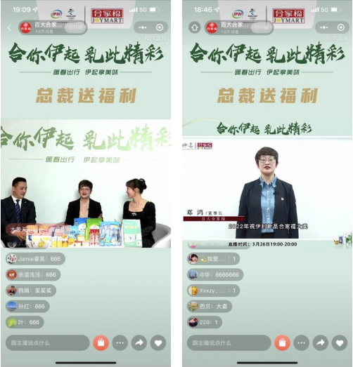 為豐富品牌營銷活動,百大合家福黨委書記、董事長鄧鴻與伊利集團(tuán)副總裁郭云龍親自踏進(jìn)直播間做起了現(xiàn)場直播。