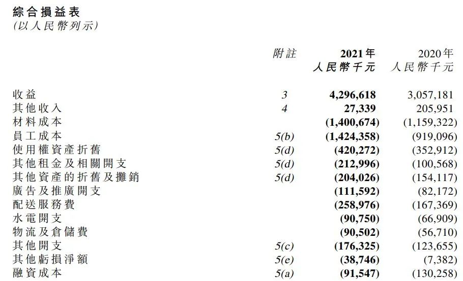根據(jù)財(cái)報(bào)顯示,2021年,奈雪的茶的收入由2020年的30.57億元上升至42.96億元,同比增長40.5%。收入的增長主要來源于奈雪的茶茶飲店規(guī)模的擴(kuò)張。