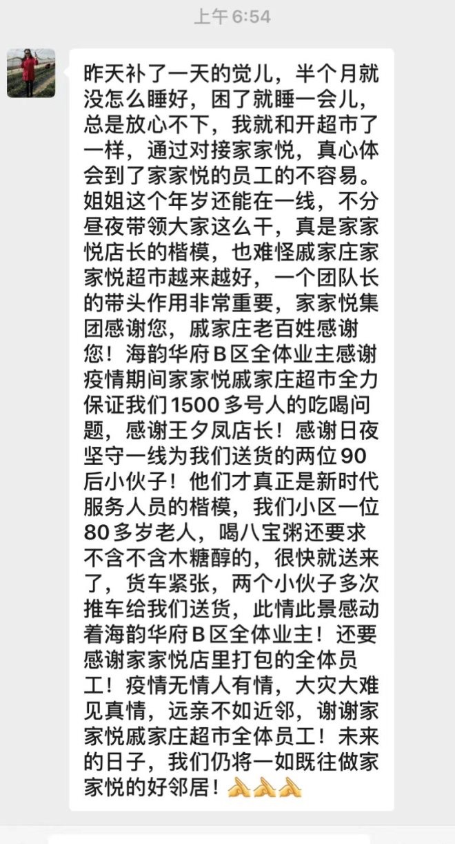 3月25日,海韻社區(qū)主任魏桂杰給戚家莊店長王夕鳳專門發(fā)了一條長微信: “疫情無情人有情,大災(zāi)大難見真情,遠親不如近鄰,謝謝家家悅戚家莊店超市全體員工!未來的日子,我們?nèi)詫⒁蝗缂韧黾壹覑偟暮绵従樱 ?nbsp;字里行間里表達了對門店和員工的感謝,對店長王夕鳳帶領(lǐng)的優(yōu)秀團隊贊不絕口。