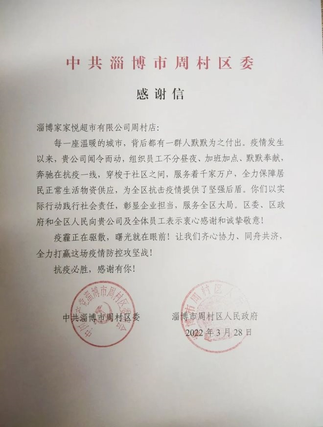 3月28日,家家悅淄博周村店收到了一封來自周村區(qū)委區(qū)政府的感謝信,對疫情以來門店員工不分晝夜、加班加點,全力保障居民生活物資供應(yīng)的做法表示感謝。