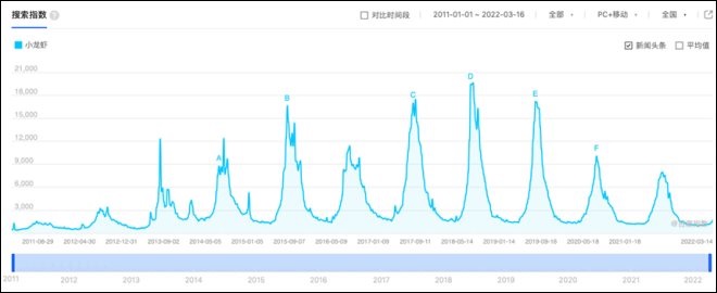 從上圖百度搜索指數能明顯看到,2017-2018年是小龍蝦熱度的高潮期,2019之后持續(xù)下降,甚至低于2015年小龍蝦“成名”之前的時候。