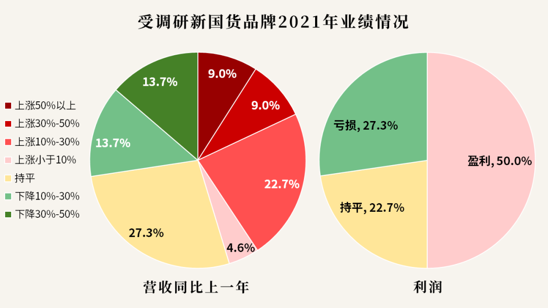 當(dāng)然,我們也不能閉眼夸新國(guó)貨依舊熱度不減。在我們收到的問卷反饋中,2021年度業(yè)績(jī)出現(xiàn)虧損的新國(guó)貨品牌比例達(dá)到了27.3%,其中有兩家企業(yè)營(yíng)收下降超30%。