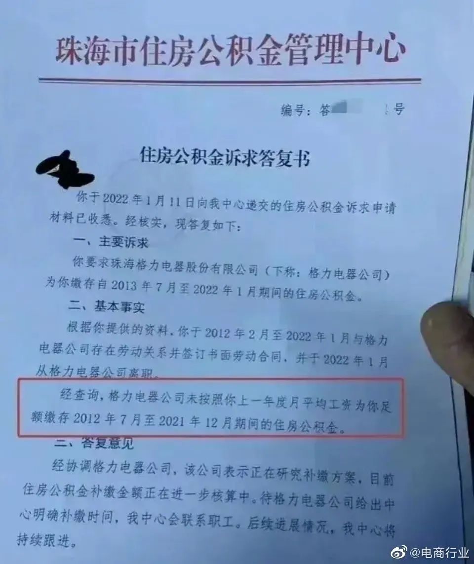近日,一名年初剛剛從格力離職的員工發(fā)布了一張來自珠海市住房公積金管理中心的訴求答復(fù)書,顯示這位員工2012年2月至2022年1月就職于格力。但是格力未按照該員工上一年度平均工資為其足額繳存2012年7月至2021年12月期間的住房公積金。