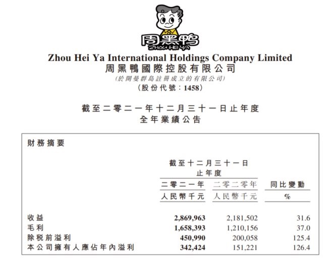聯(lián)商快訊:3月30日,周黑鴨發(fā)布2021年業(yè)績(jī)報(bào)告。