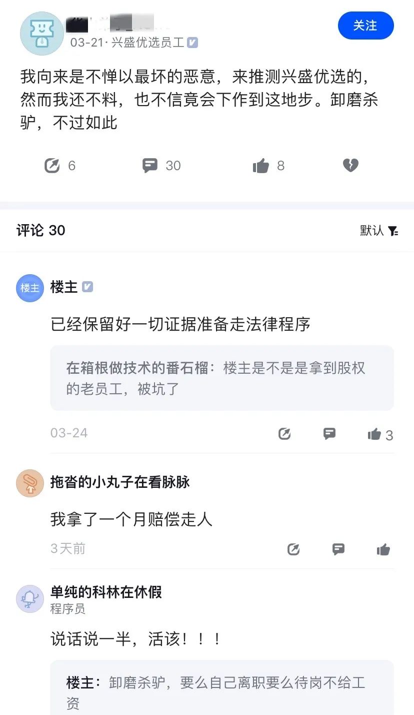 3月24日左右,認證為興盛優(yōu)選員工的兩名網(wǎng)友在脈脈上爆料,“我拿了一個月賠償走人。”“卸磨殺驢,不過如此,已經(jīng)保留好一切證據(jù)準備走法律程序!痹救藛T汰換率就相對高的興盛優(yōu)選,近期似乎也出現(xiàn)了裁員動作。