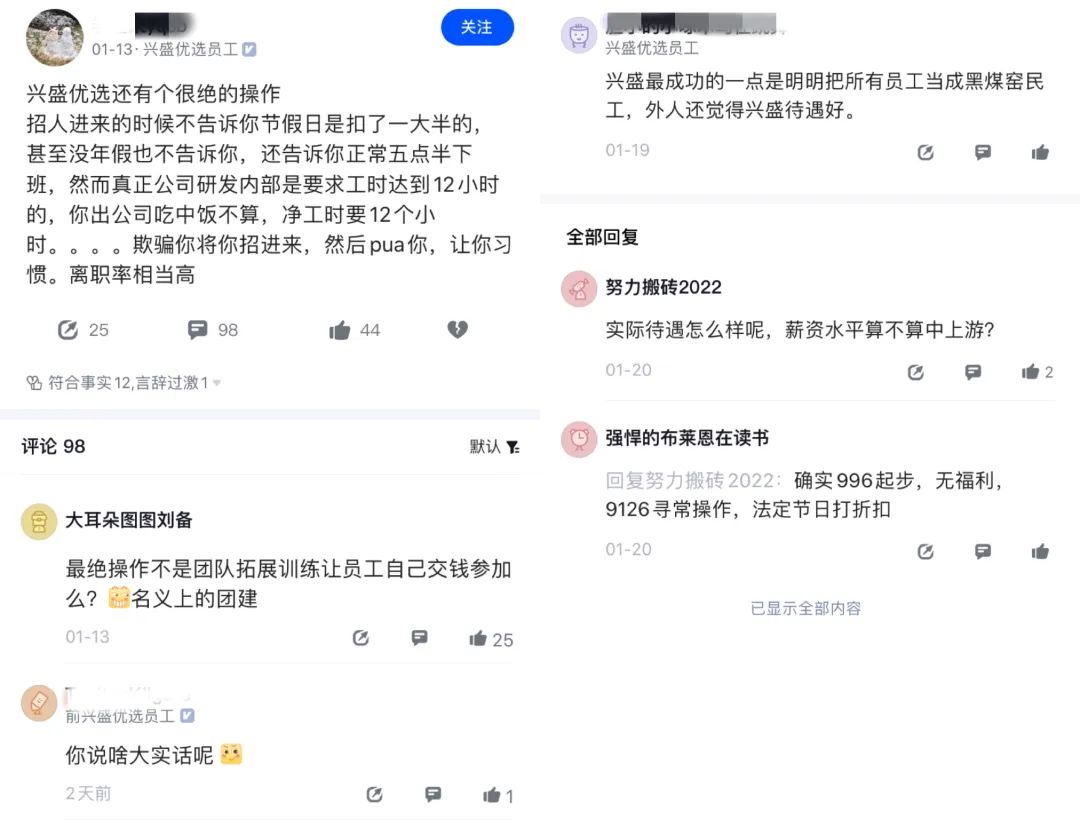 “興盛最成功的一點是明明把所有員工當成黑煤窯民工,外人還覺得興盛待遇好!痹诿}脈等社交媒體平臺上,不少內(nèi)部員工吐槽興盛優(yōu)選“996”單休、福利差、法定節(jié)假日打折扣等問題。