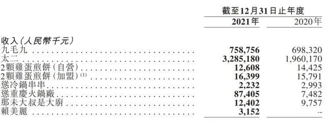 剛剛披露的2021年年報(bào)顯示,九毛九西北菜、太二酸菜魚、2顆雞蛋煎餅、慫冷鍋串串、慫重慶火鍋廠、那未大叔是大廚、賴美麗青花椒烤魚七個(gè)品牌在去年累計(jì)開店133家,其中包括1家九毛九西北菜、122家太二、1家2顆雞蛋煎餅加盟店、7家慫火鍋及2家賴美麗。