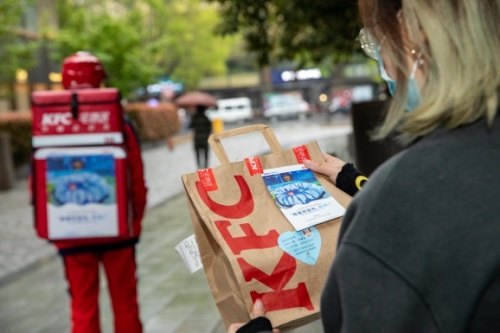 活動的3天里,這6名肯德基紅騎士所配送的餐點都會附贈一張孩子們繪制的亞運村場館小卡片,通過這些卡片,讓孩子們的作品搭上美味的順風車,一一送到顧客們的手中,讓更多在辦公室工作的群體、宅家的朋友,都能參與到這場流動畫展中來。
