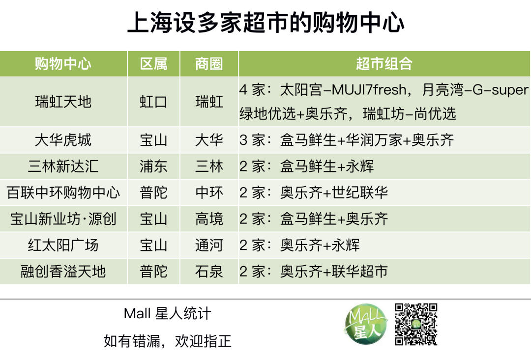 據(jù)聯(lián)商網(wǎng)上海商情專欄&Mall星人統(tǒng)計,目前上海擁有2家或以上超市的購物中心有:瑞虹天地,擁有MUJl生鮮復合店(太陽宮)、G-super綠地優(yōu)選+奧樂齊(月亮灣)、尚優(yōu)選(瑞虹坊);大華虎城,擁有盒馬鮮生、奧樂齊和華潤萬家;三林新達匯,擁有盒馬鮮生和永輝;百聯(lián)中環(huán)購物中心,擁有奧樂齊和世紀聯(lián)華;香溢融創(chuàng)天地,擁有奧樂齊和聯(lián)華超市;寶山新業(yè)坊·源創(chuàng),擁有盒馬鮮生和奧樂齊;紅太陽廣場,擁有奧樂齊和永輝。