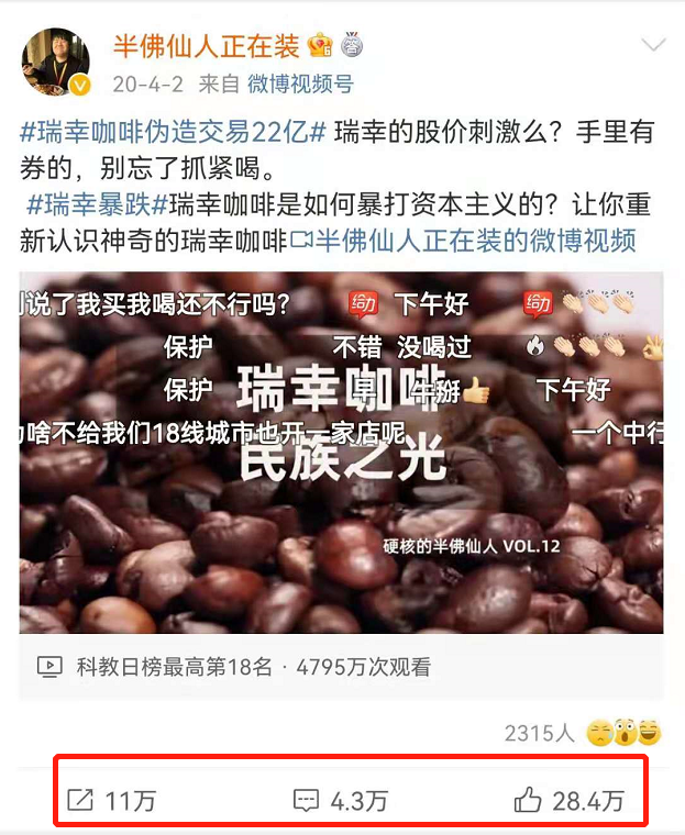 之前有自媒體人曾發(fā)布視頻,講述瑞幸如何“割美國韭菜”,在視頻之中,瑞幸儼然成了“騙美國投資人的錢補(bǔ)貼中國用戶的國貨之光”、“資本主義薅羊毛機(jī)”……這樣的說法得到了數(shù)十萬的點(diǎn)贊和轉(zhuǎn)發(fā)。