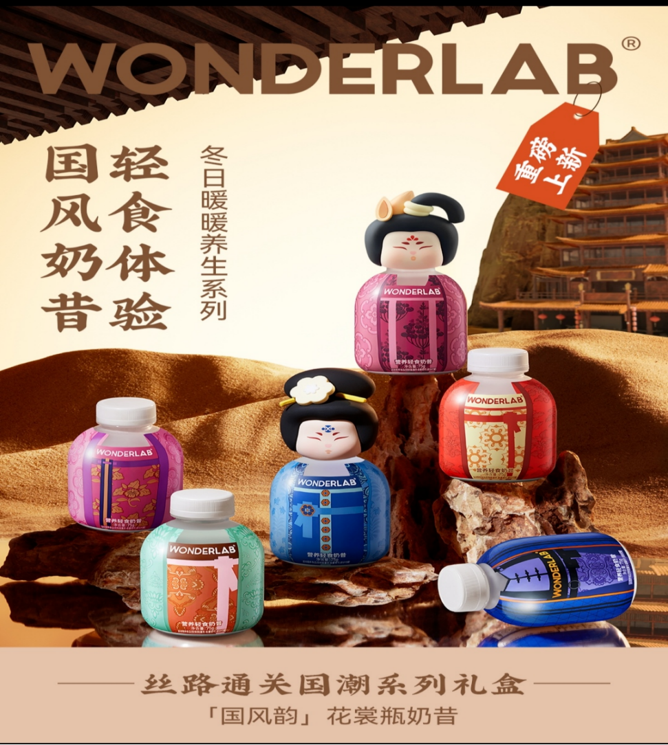以傳統(tǒng)元素為側重的典型如WonderLab,作為一個新世代新營養(yǎng)品牌,產(chǎn)品以益生菌、代餐奶昔等產(chǎn)品為主,乍一看,這怎么能和傳統(tǒng)文化扯上關系呢?可是WonderLab做到了。