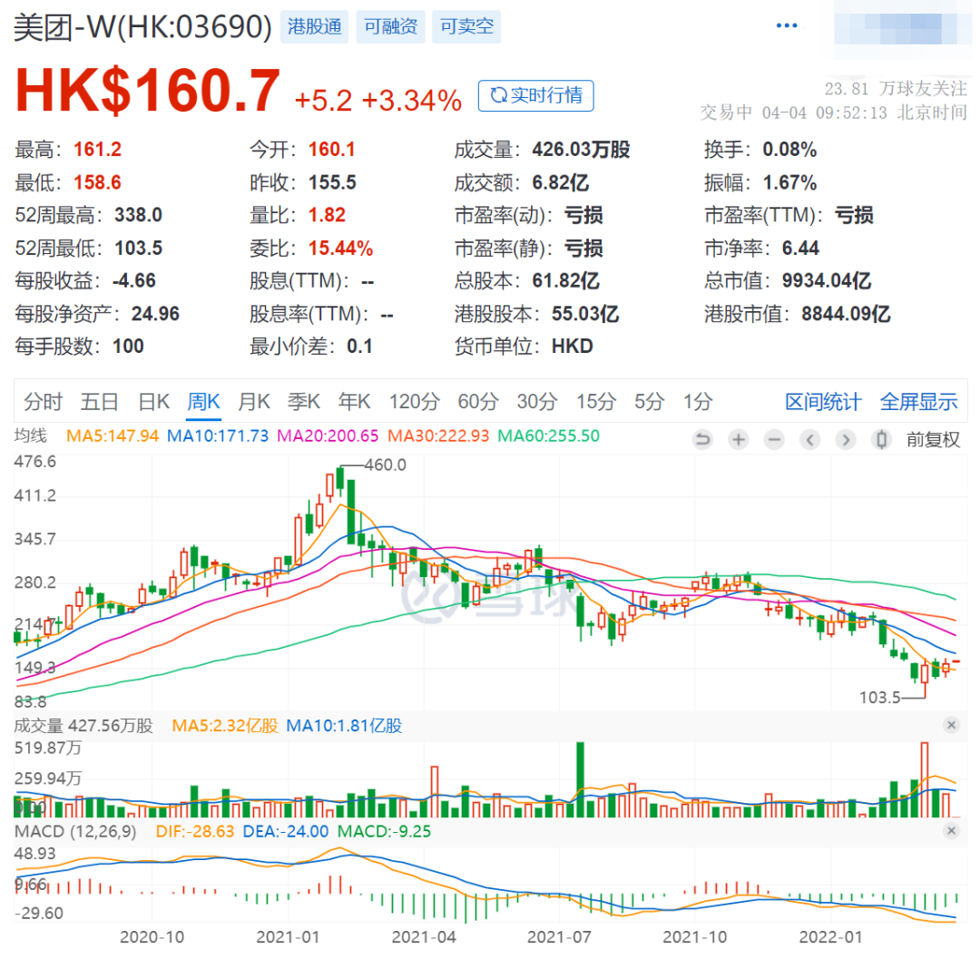 同比去年3月份,美團(tuán)在不到一年的時(shí)間里縮水了2.2萬億港元,股價(jià)跌幅超過了77%。
