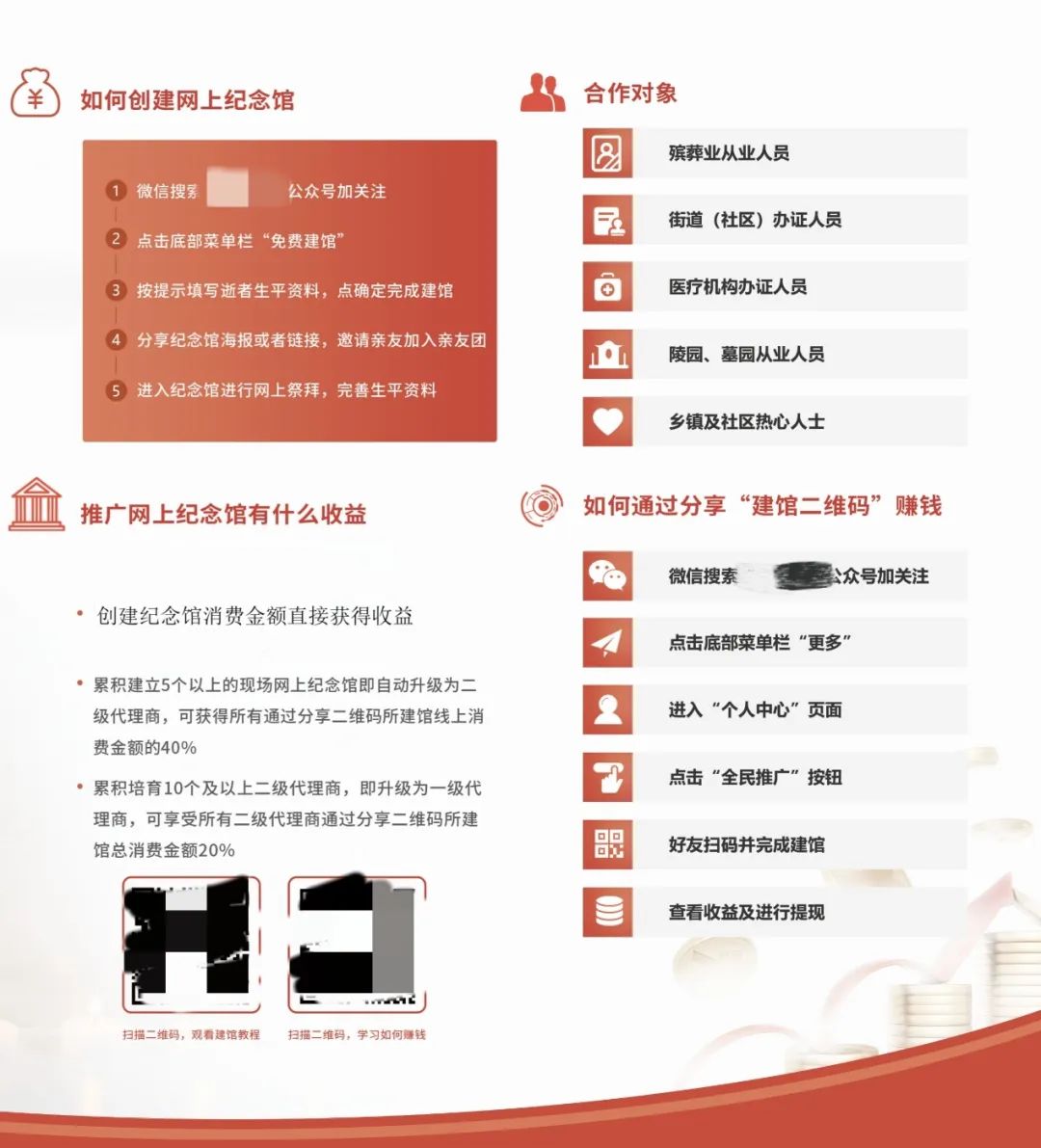 如果覺得開發(fā)一個云祭祀APP價格過高,還能“0成本”入局。心紀(jì)奠的微信公眾號中就有一個名為“分銷加盟”的服務(wù)板塊,只要在后臺點(diǎn)擊“全民加盟”,就能獲得加盟經(jīng)營權(quán)。