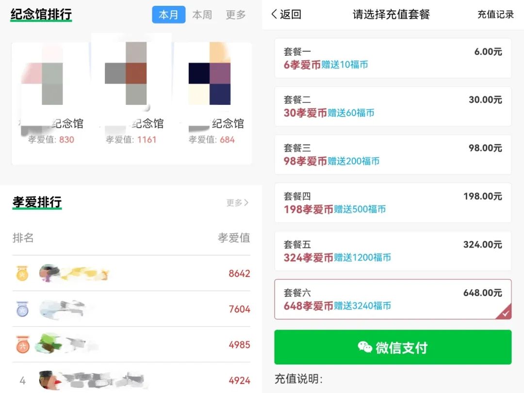 在“心紀(jì)奠”“紀(jì)念寶”等App和小程序的首頁,根據(jù)紀(jì)念館和用戶的孝愛值高低推出了“孝愛值”排行榜,而“孝愛值”評估標(biāo)準(zhǔn)則是用戶在平臺上付出的金錢多少。不少人受到傳統(tǒng)文化的影響,在平臺上一擲千金:在“心紀(jì)奠”首頁的排行榜上,第一名用戶的“孝愛值”為8642,根據(jù)充值的數(shù)額換算,最低花費(fèi)也已經(jīng)超過1500元。
