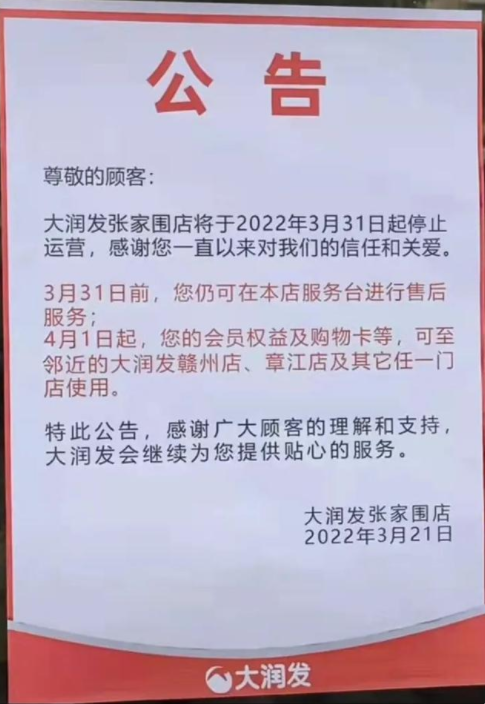 聯(lián)商快訊:3月31日,大潤(rùn)發(fā)南昌青山湖店、贛州張家圍店雙雙停止運(yùn)營(yíng)。