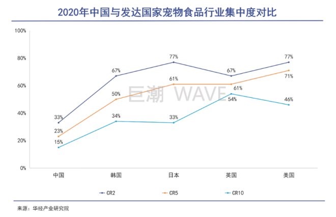即便中寵股份和佩蒂賣力銷售,行業(yè)集中度仍維持在較低水平。根據(jù)《2020年寵物行業(yè)白皮書》數(shù)據(jù)顯示,2020年中國寵物食品市場的CR5為23%、CR10為33%,對比日本的CR5為61%和CR10為77%,中國寵物食品市場集中度有進一步提升的空間。