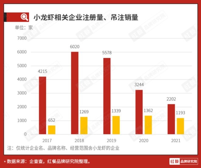 與此同時(shí),小龍蝦相關(guān)企業(yè)的吊注銷量卻高居不下,到了2021年,吊注銷量達(dá)到了1193家,占到了新注冊量的一半。