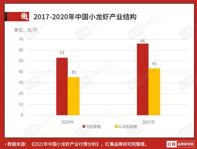 以潛江中國小龍蝦交易中心數(shù)據(jù)為例,潛江市9錢規(guī)格的小龍蝦2020年平均價(jià)格為53元/斤,2021年平均價(jià)格為66元/斤,上升了24.5%;6-8錢規(guī)格小龍蝦2020年平均價(jià)格為35元/斤,2021年平均價(jià)格為43元/斤,上升了23%。
