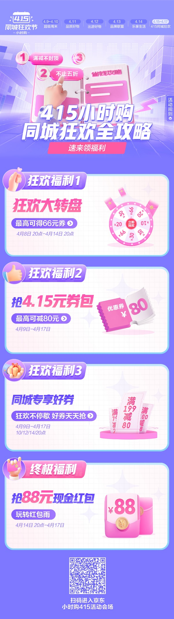 今年的415,京東到家將進(jìn)一步深化與京東場域營銷共振,強(qiáng)化并升級(jí)同城消費(fèi)體驗(yàn)。除了京東首頁“附近頻道”可直達(dá)415活動(dòng)會(huì)場,京東首頁的秒殺頻道、新品頻道、品牌閃購頻道等更多場域都將參與到415同城購物節(jié)中,打造“超級(jí)周末”“超級(jí)秒殺日”“超級(jí)品牌聯(lián)盟”等活動(dòng)。